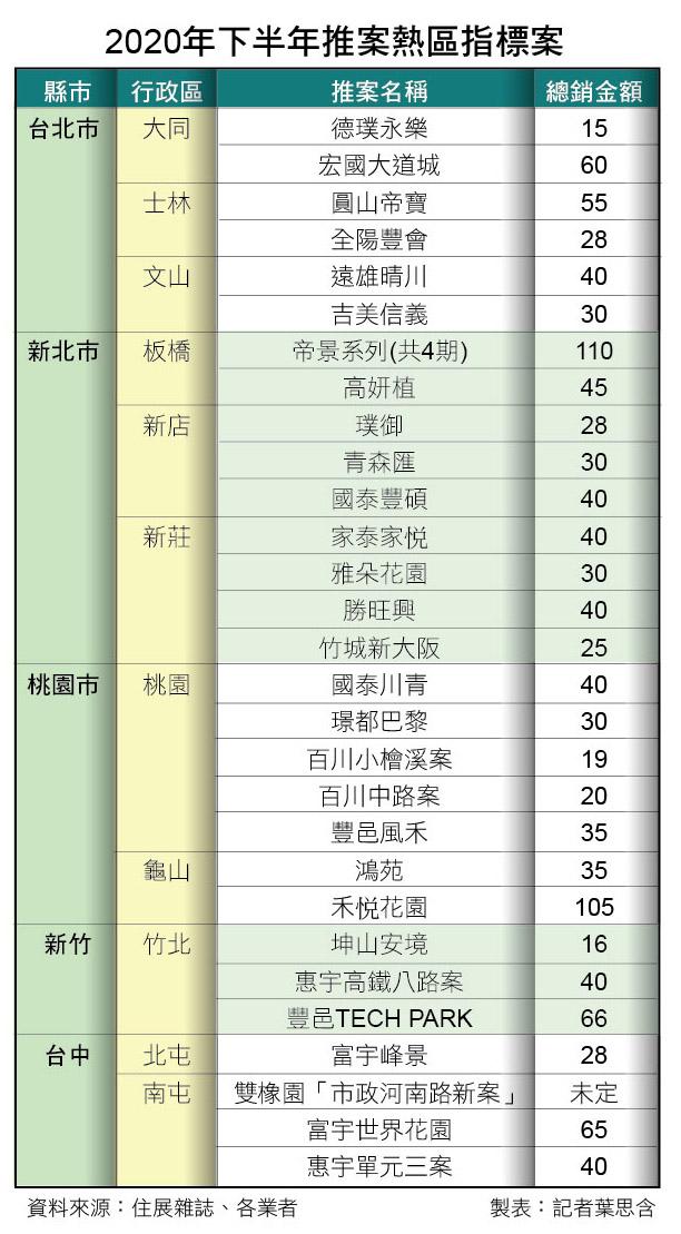 因肺炎疫情衝擊,全台建商今年上半年幾乎皆遞延推案時程,近來隨著疫情趨緩開始重新醞釀推出,帶動今年下半年推案熱度,如北市因危老改建效益出現許多舊市區新案,新北則聚焦各大重劃區,桃園以桃園區、龜山區最火熱,台中北屯區、南屯區為最大戰場,後疫情時代來臨,全台推案熱區將在下半年重新開打。